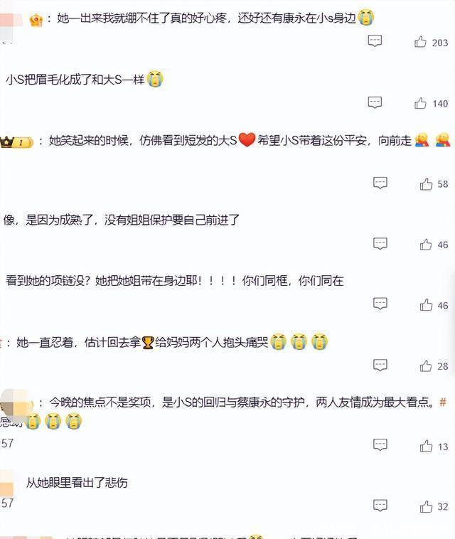 金钟奖现场,无论是从小S出场还是到后面的采访环节,有太多的感人画面,包括小S拿奖后将奖项送给妈妈,希望能填补妈妈的一个洞,每次谈到姐姐都会哽咽,她也表示姐姐离开的人生很辛苦,亲人离世不在一瞬间,而在于生活中的每个细节,每个和大S有关的点滴都会勾起小S无限的思念。无论是小S的家人,还是她的朋友,每个看到小S的人都为她鼓掌,希望她振作起来。
